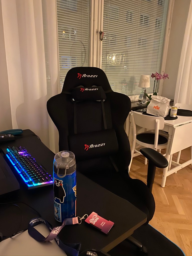 Yesterday I ordered a desk and chair. The desk came yesterday, and I put it together in order to have an upright area to work. My new chair came in today, and I assembled it and set it up to my personal sitting preferences. It’s not nearly as nice as my Secret Labs Omega D.Va chair, but it’ll do for now. It’s an Arozzi something something and it is a beefy boi (weighing in at almost 26 kg!). Chances are, when I get the funds and the Omegas are back in stock I’ll replace it with one of those, but I think this will do for daily work/gaming needs until I have the disposable funds to purchase such an extravagant luxury.